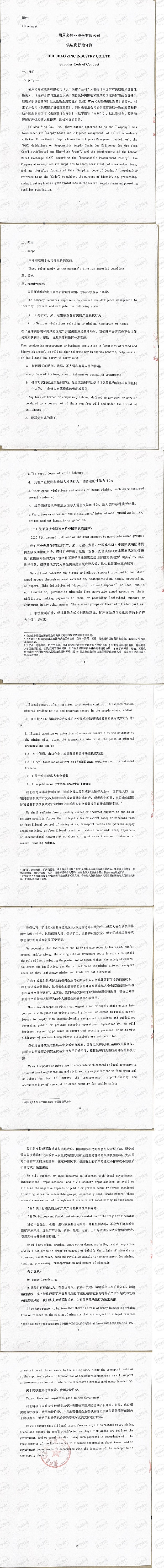 葫蘆島鋅業(yè)股份有限公司供應(yīng)商行為守則(中英文)